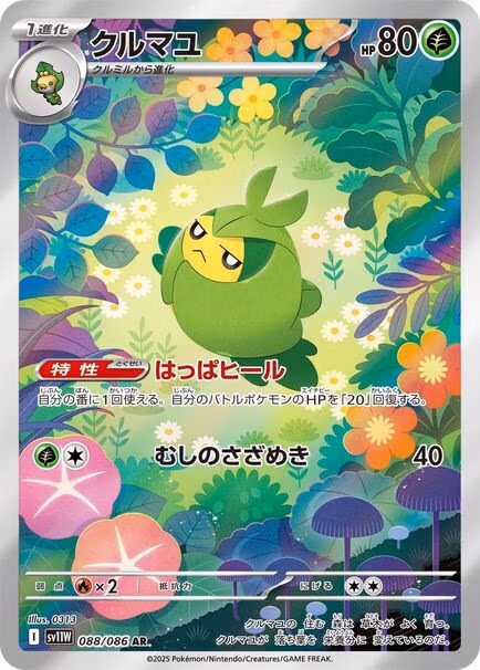 Swadloon AR #088/086 – Pokémon White Flare (sv11w) Japanese features Swadloon nestled quietly in a lush, shaded forest surrounded by thick foliage and blooming flowers.